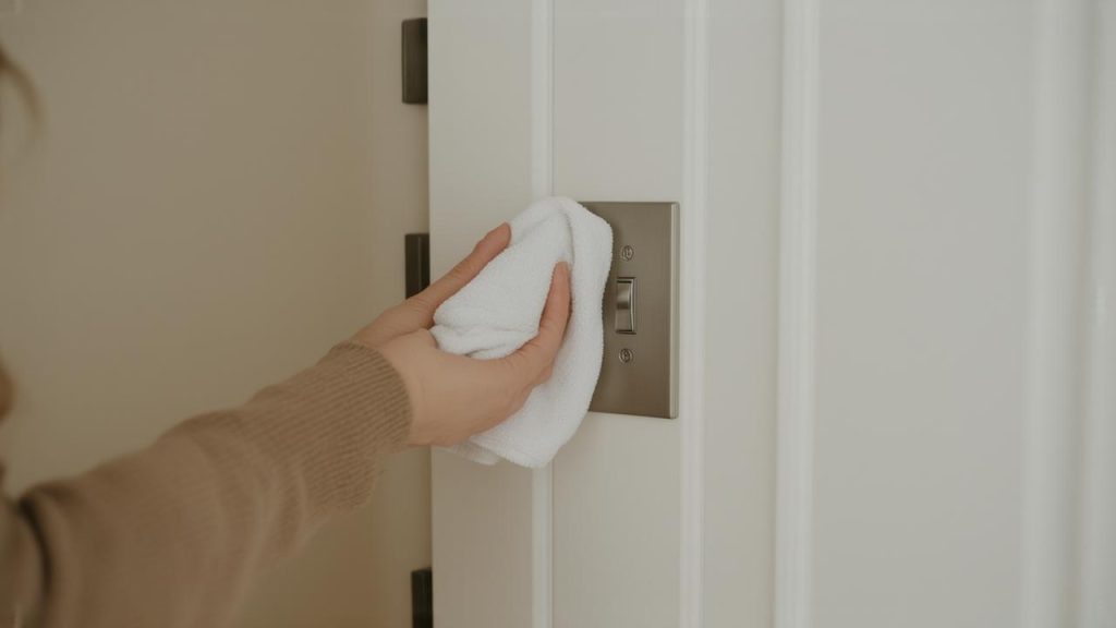 The bathroom is quiet except for the low hum of the fan and the rhythmic sound of a toothbrush. You