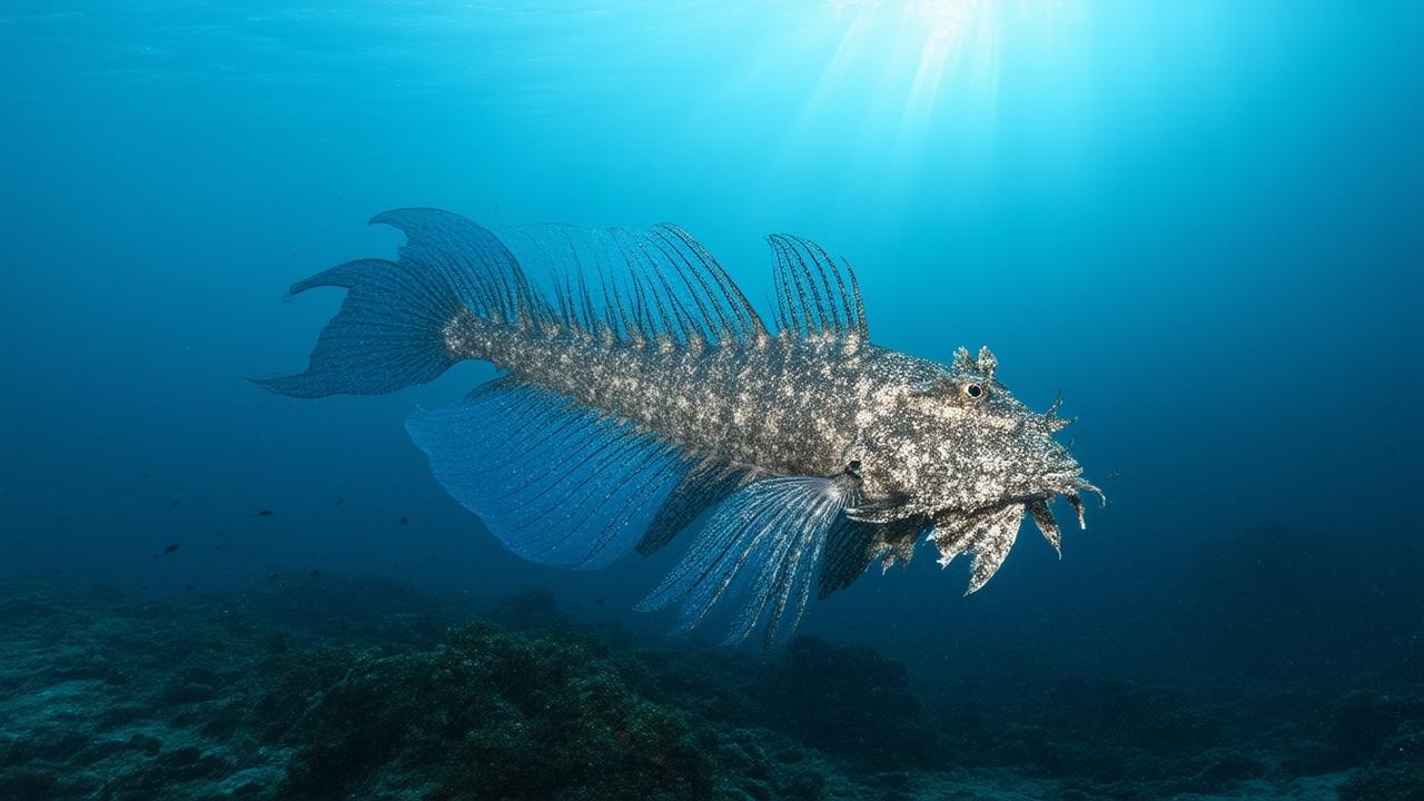 The coelacanth does not rush. It rotates into view, its body a thick, scaled cylinder studded with white blotches like old stars in a night sky. The fins—limb-like, muscular, jointed—do not flap as a tuna’s would. They row. They walk through the water with an eerily deliberate rhythm. Its eyes, glassy and pale in the beam, seem detached, as if contemplating something far older than you, your tank, or even your species.